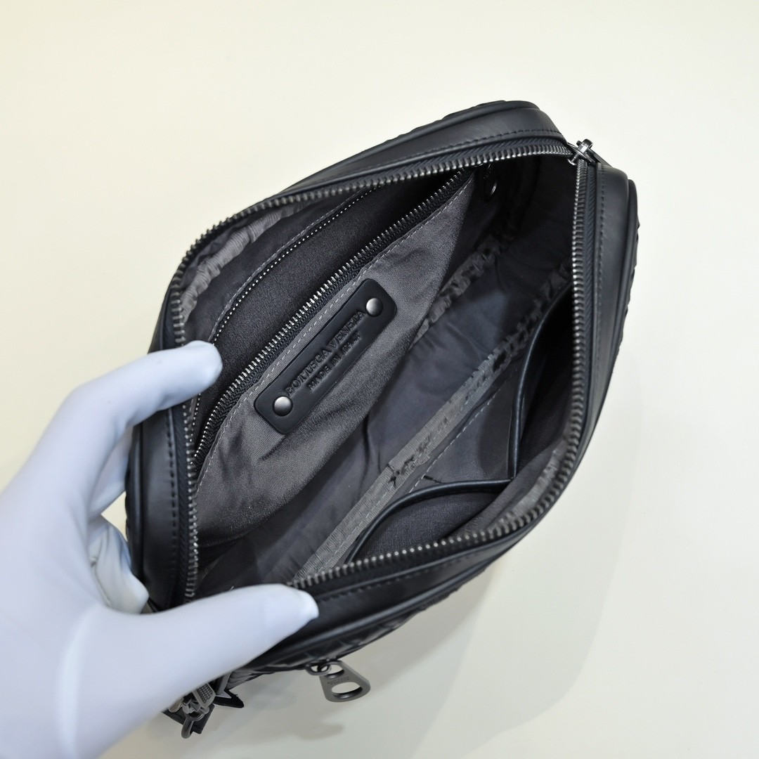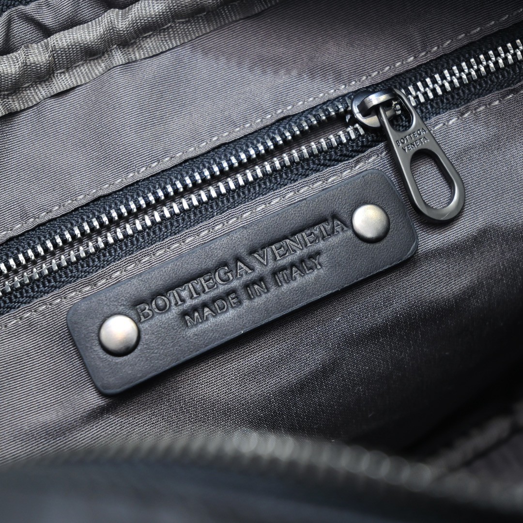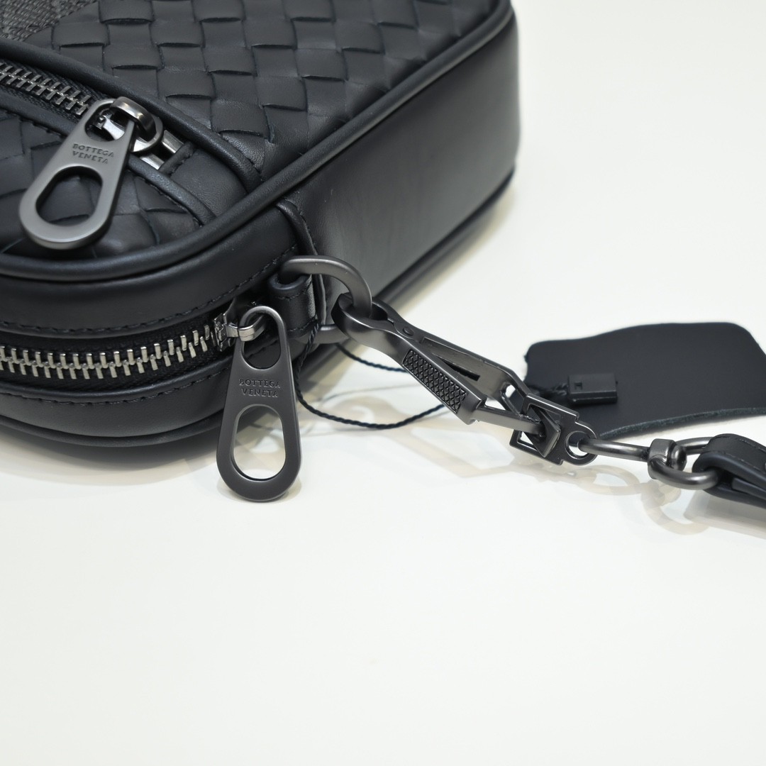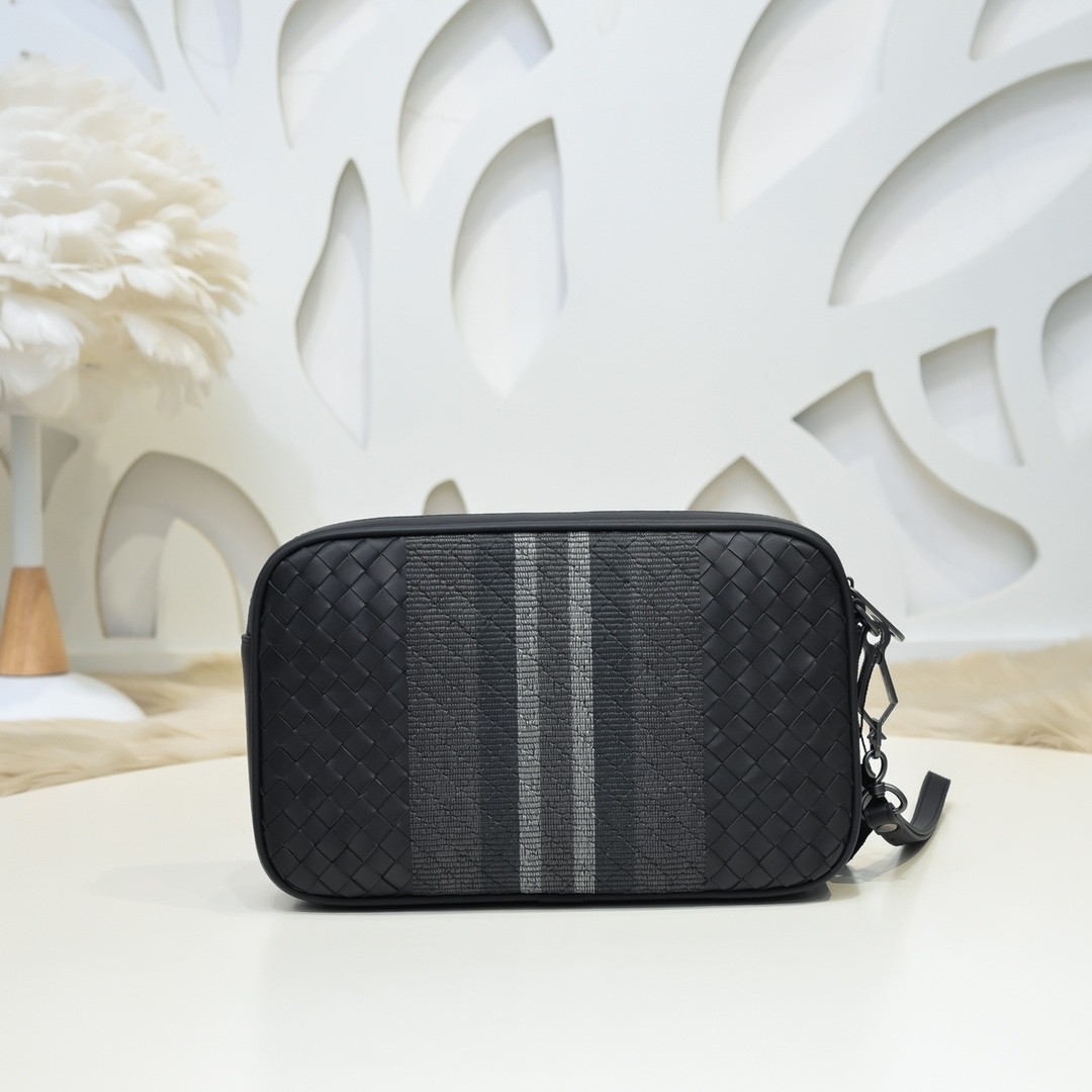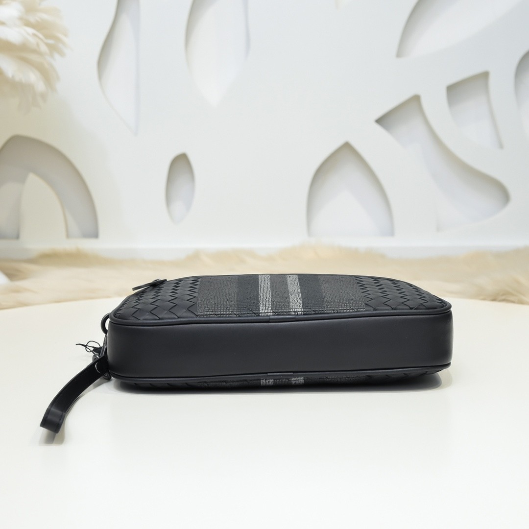 【BOTTEGA VENETA 寶緹嘉】Intrecciato 條紋拼接手拿包|黑編織 × 灰條紋 × 義式都會風
