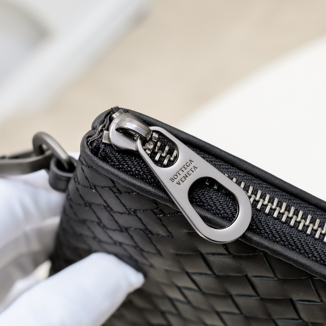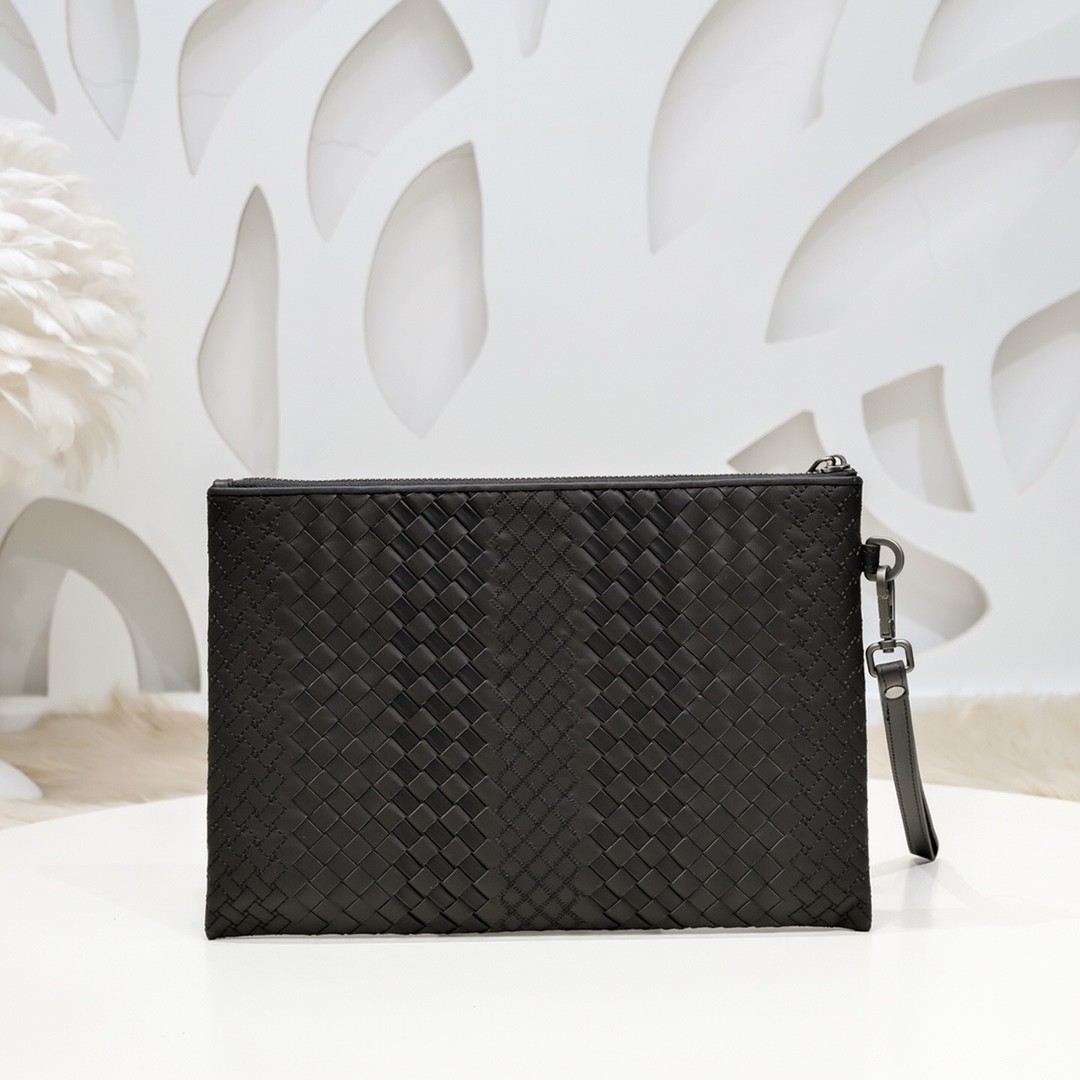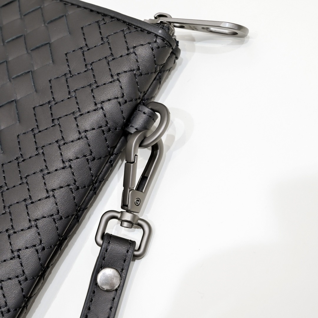 【BOTTEGA VENETA 寶緹嘉】Intrecciato 幾何刺繡手拿包|黑色編織 × 精緻格紋線繡 × 都會精品