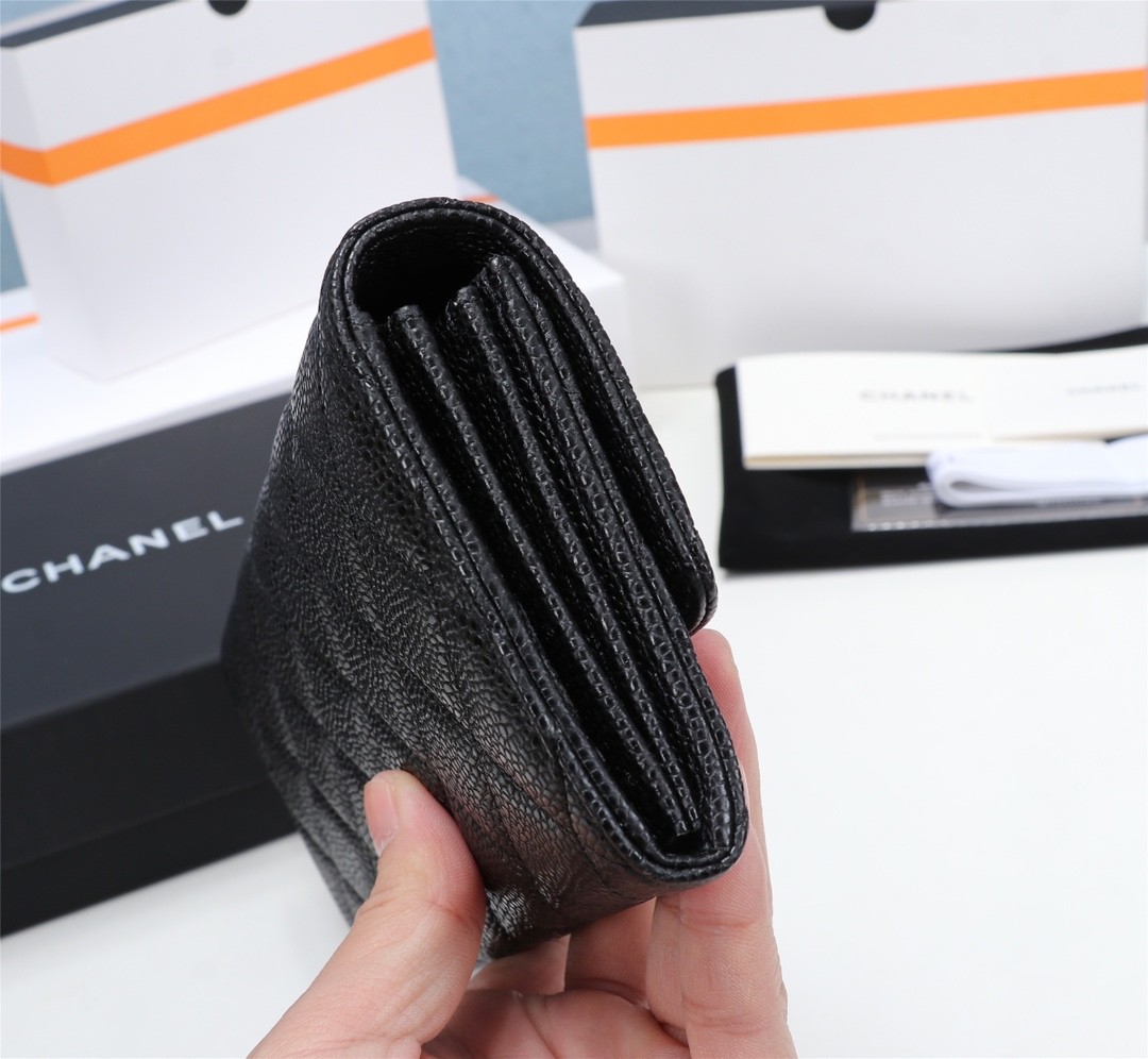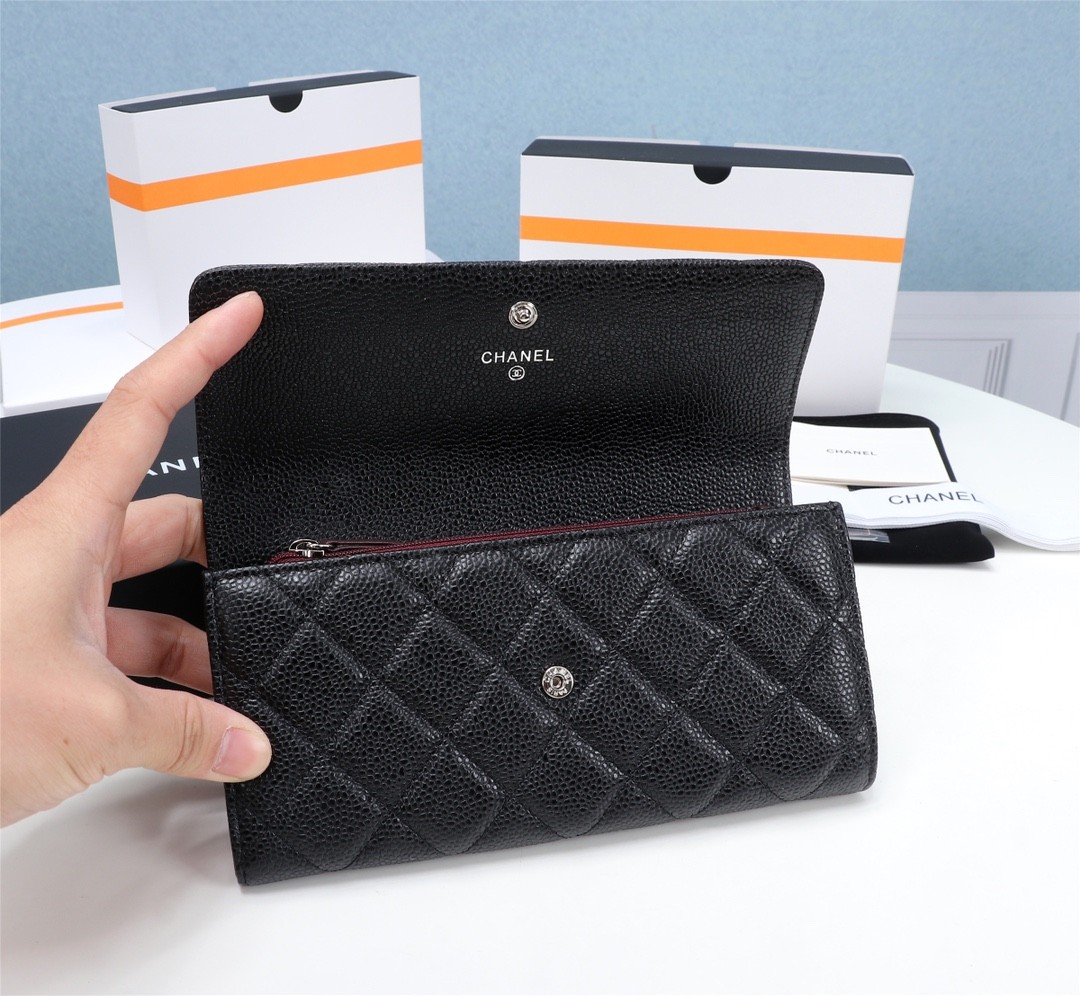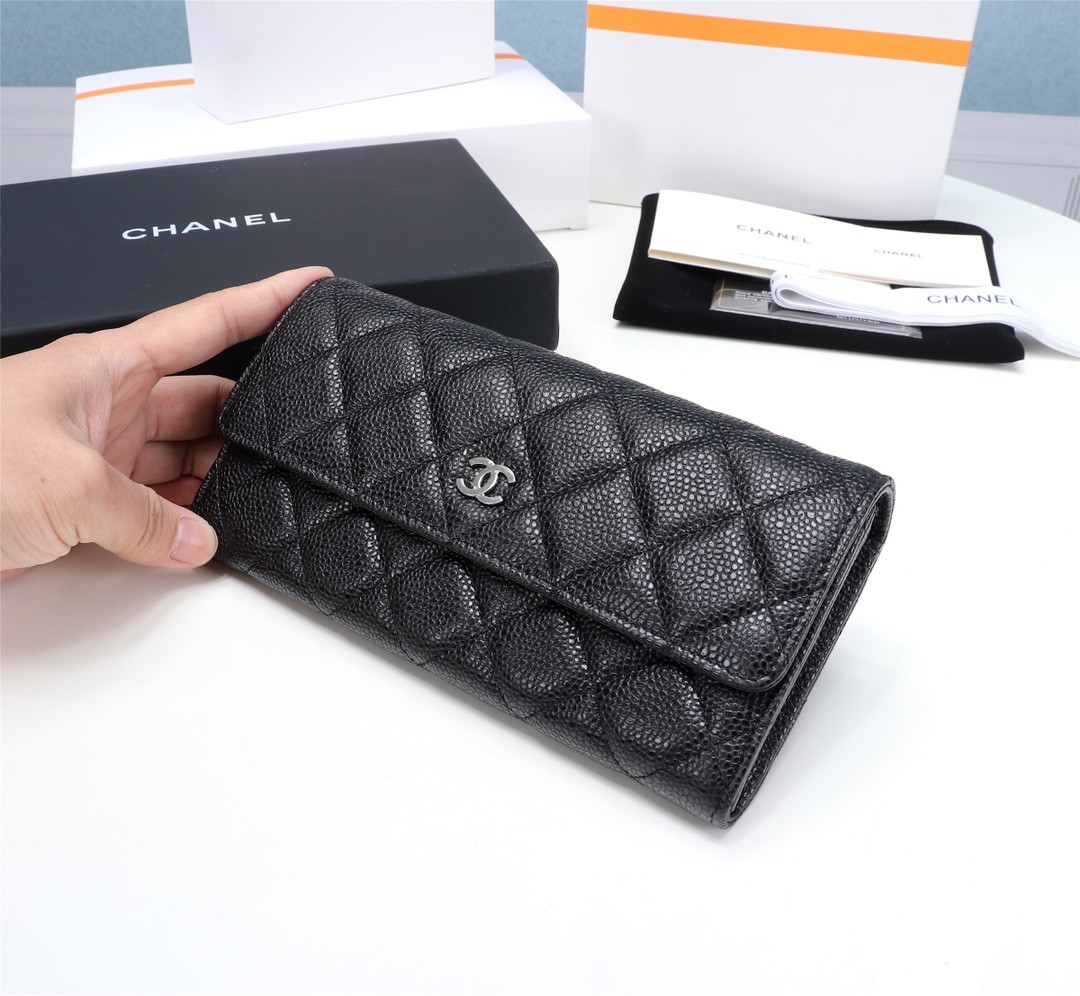 Chanel經典黑色魚子醬皮革長夾