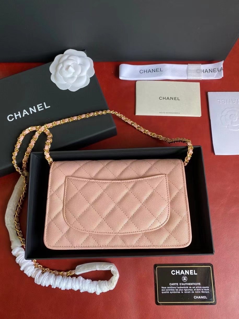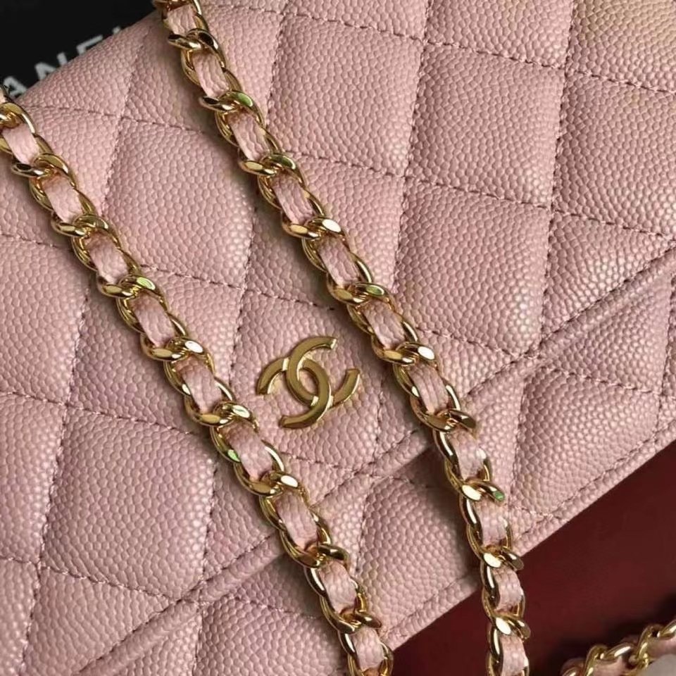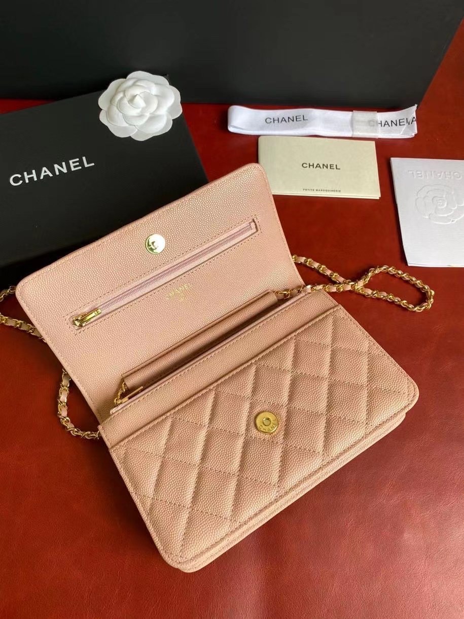 CHANEL經典菱格紋雙C粒面牛皮WOC 粉色