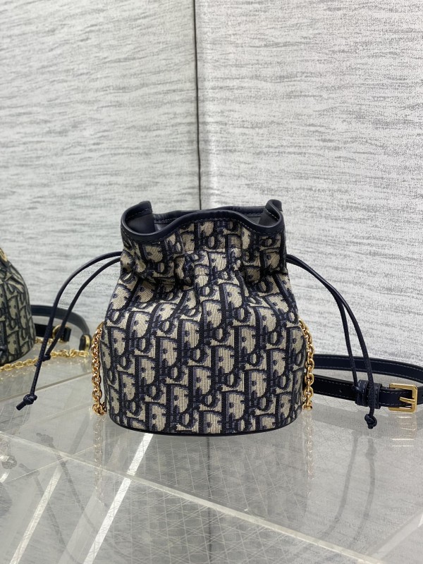 【DIOR】Oblique 提花水桶包|金屬 CD 標誌 × 經典藍灰老花 × 鏈條皮革肩背設計