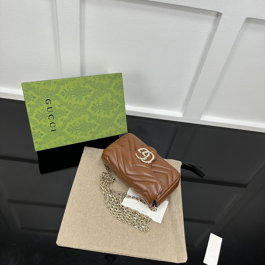 【GUCCI 古馳】GG Marmont 迷你鏈條包|焦糖棕牛皮 × 雙G金扣 × 小香風鏈條設計