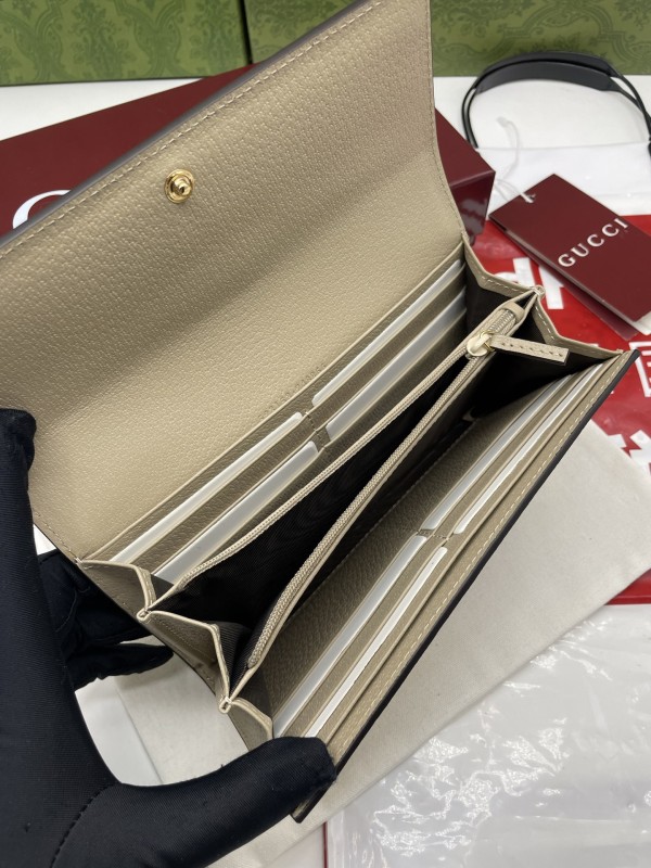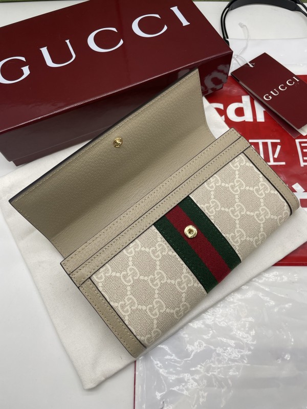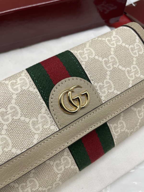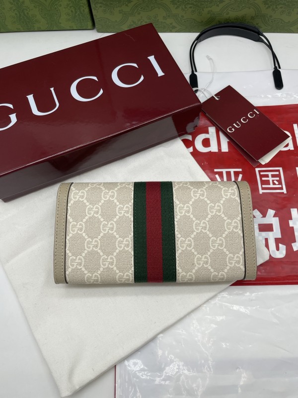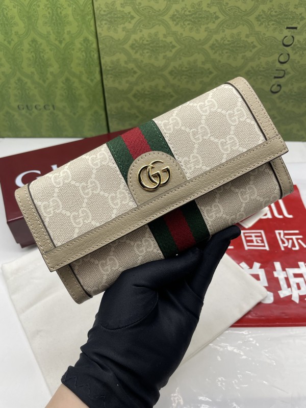 【GUCCI 古馳】GG Supreme 經典帆布長夾(米色織帶款)|金色雙G標誌、綠紅織帶、翻蓋式大容量設計