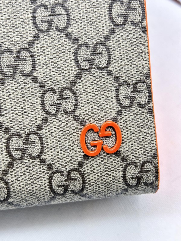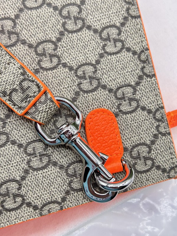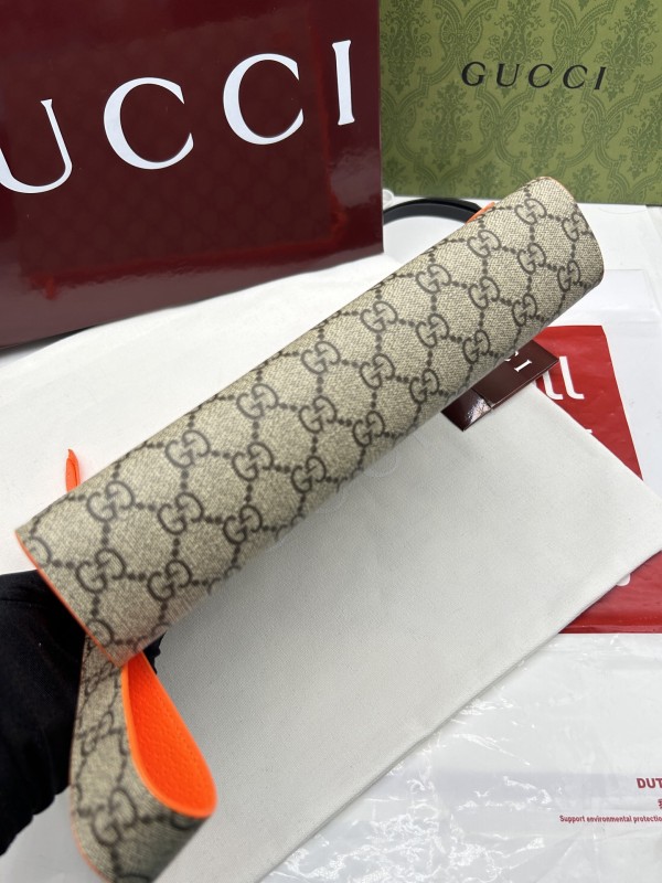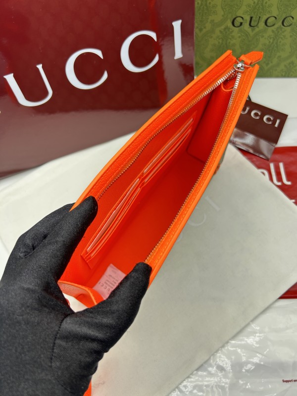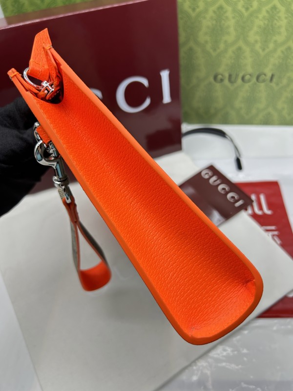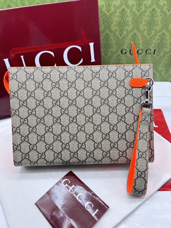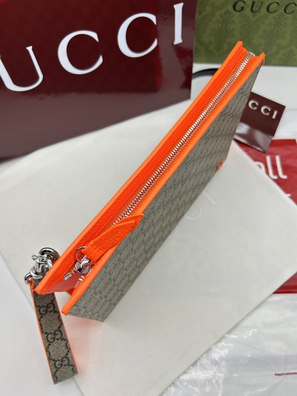【GUCCI 古馳】GG Supreme 霓虹橘邊手拿包|經典雙G帆布 × 螢光撞色設計 × 時尚收納包
