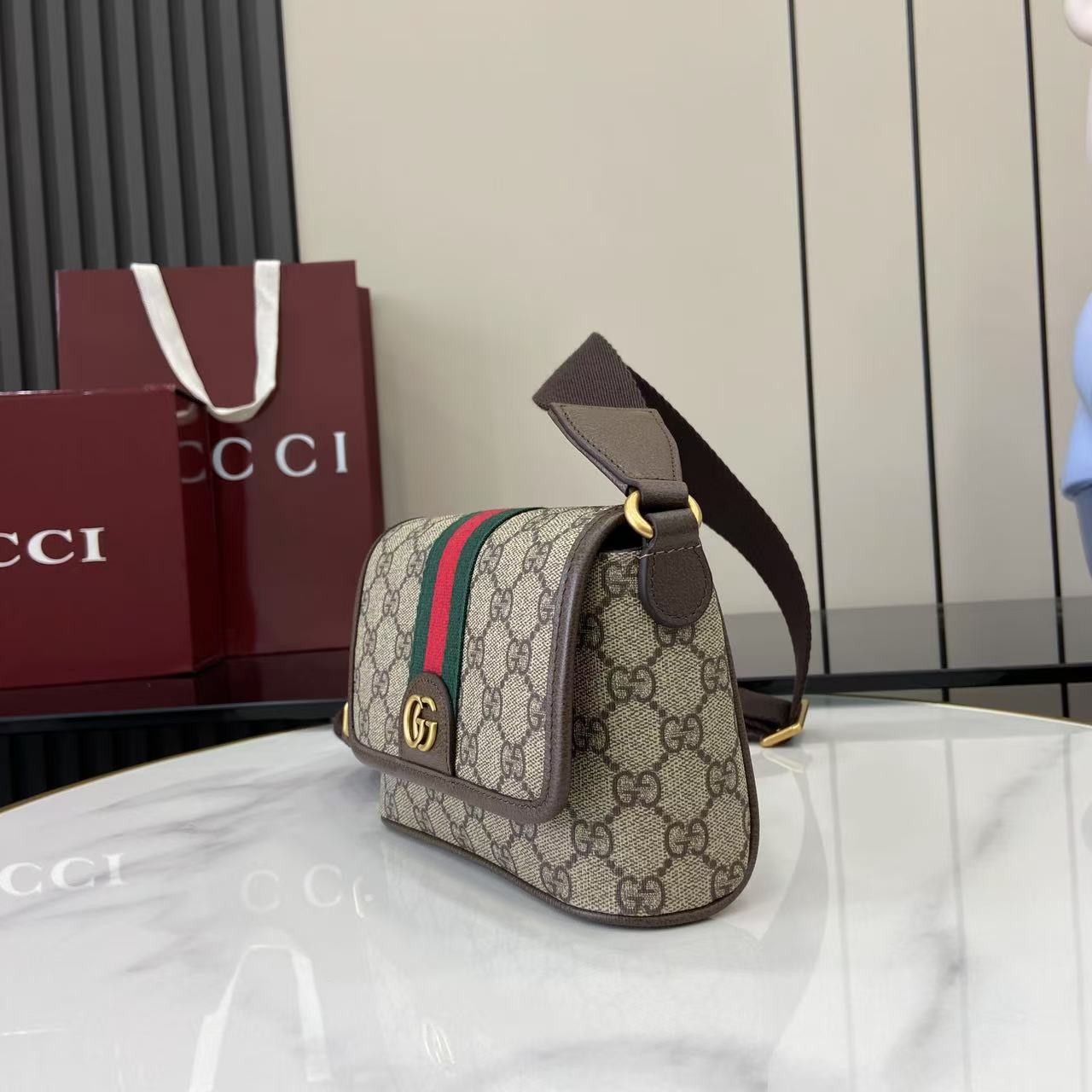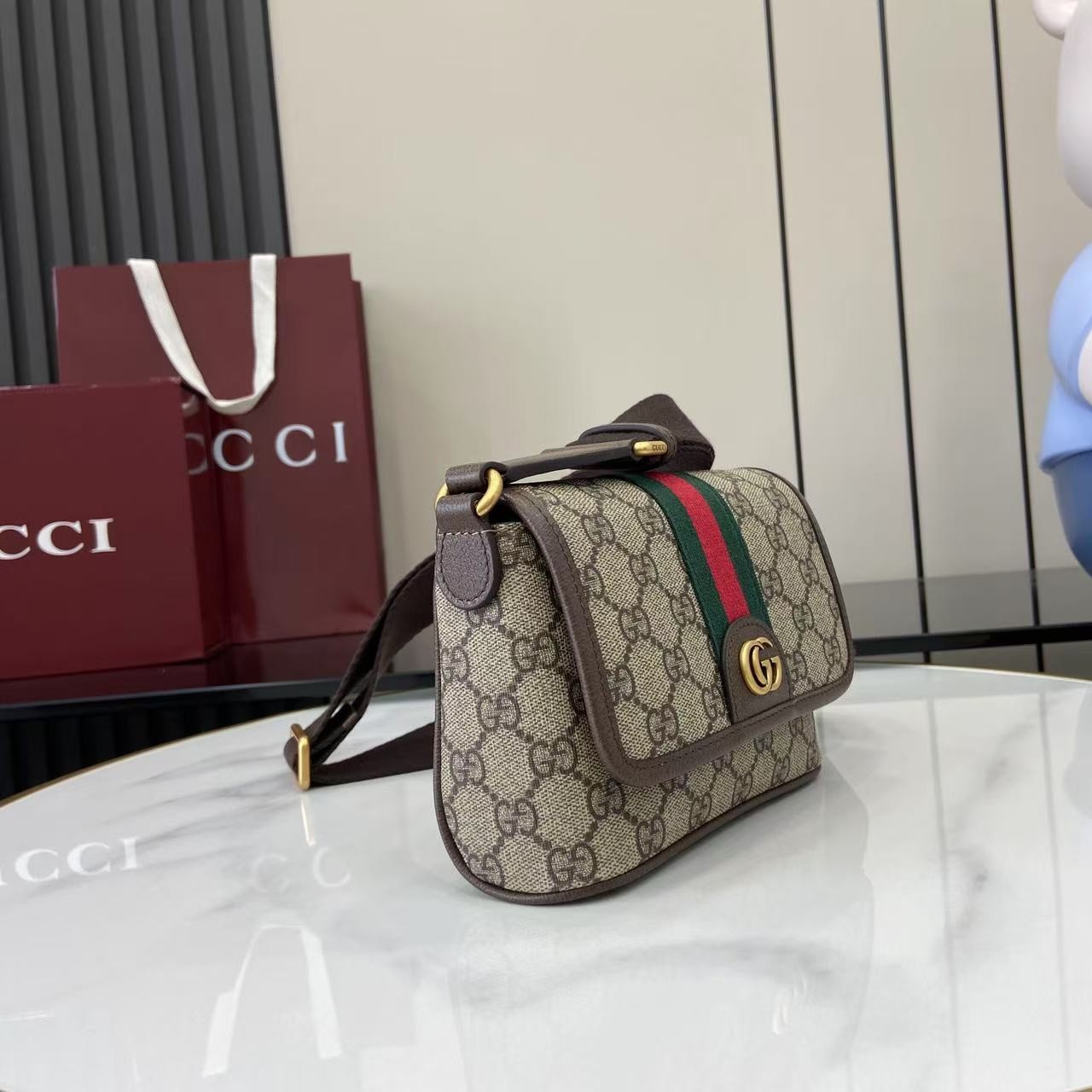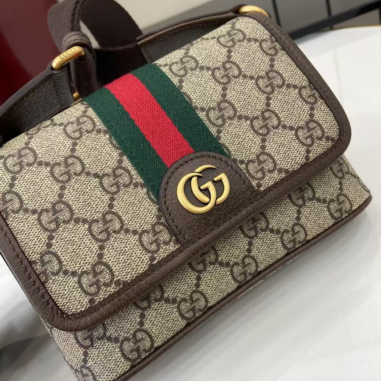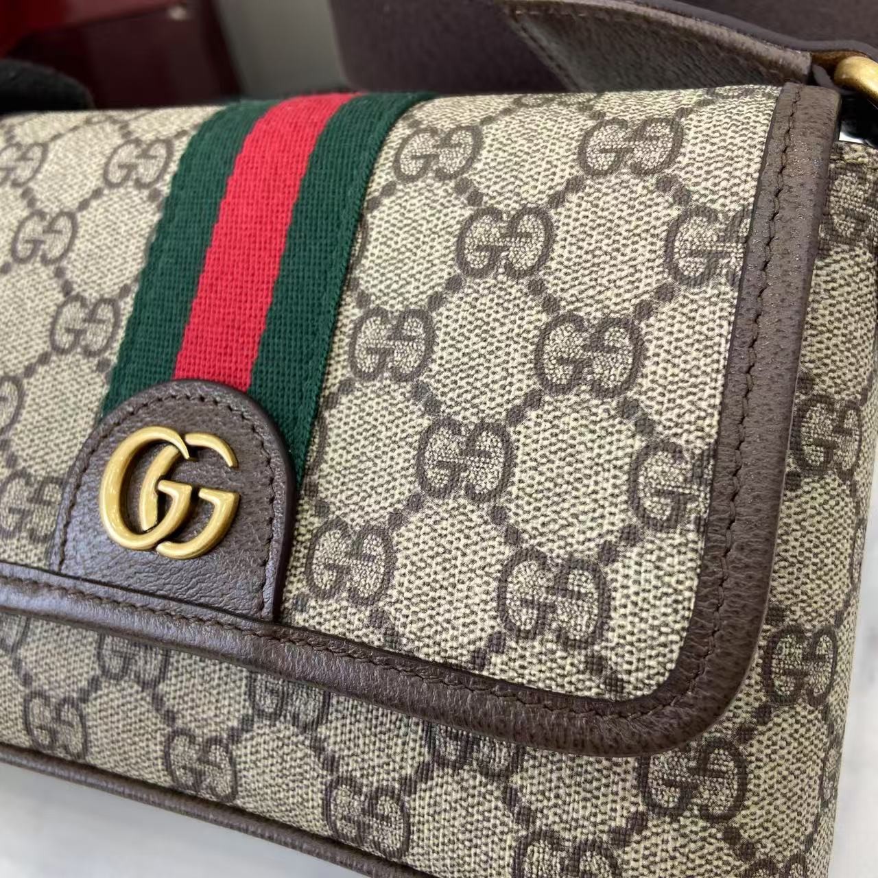 【GUCCI 古馳】Ophidia GG 老花迷你斜背包|經典紅綠織帶 × 雙G金扣 × 復古帆布拼皮設計