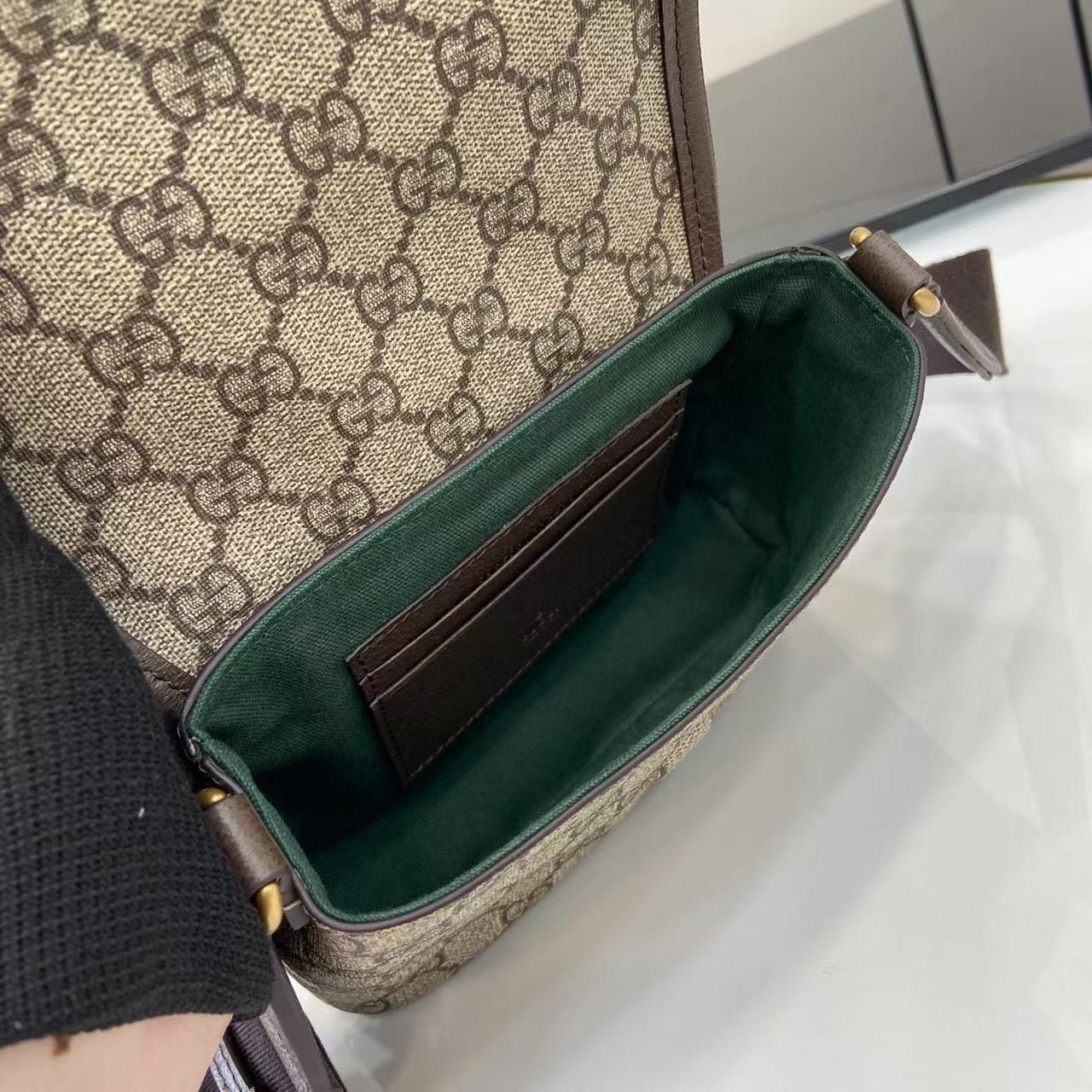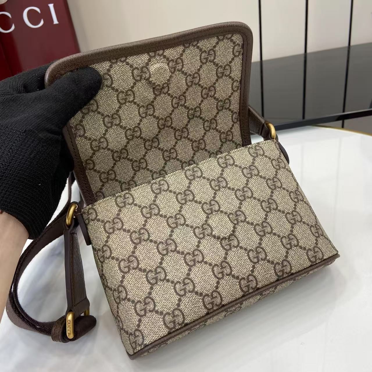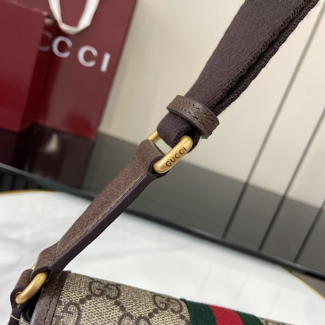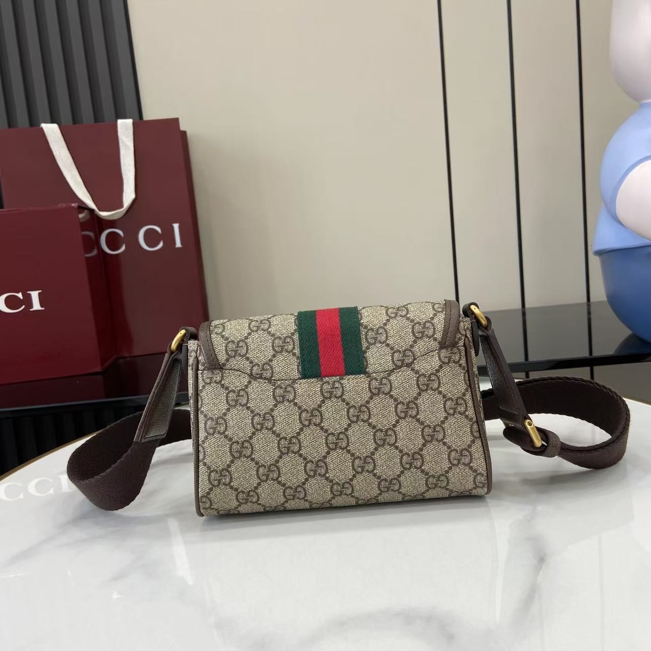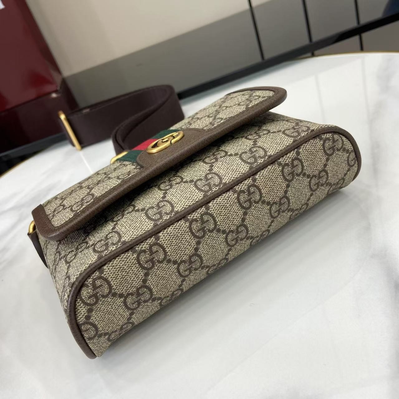 【GUCCI 古馳】Ophidia GG 老花迷你斜背包|經典紅綠織帶 × 雙G金扣 × 復古帆布拼皮設計