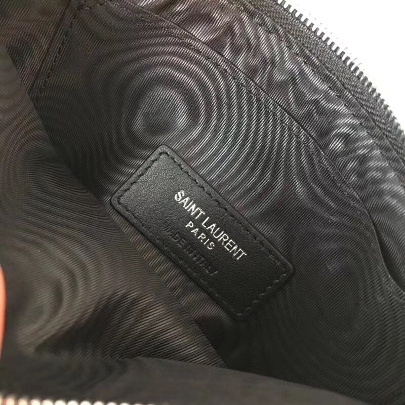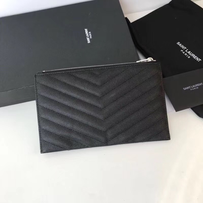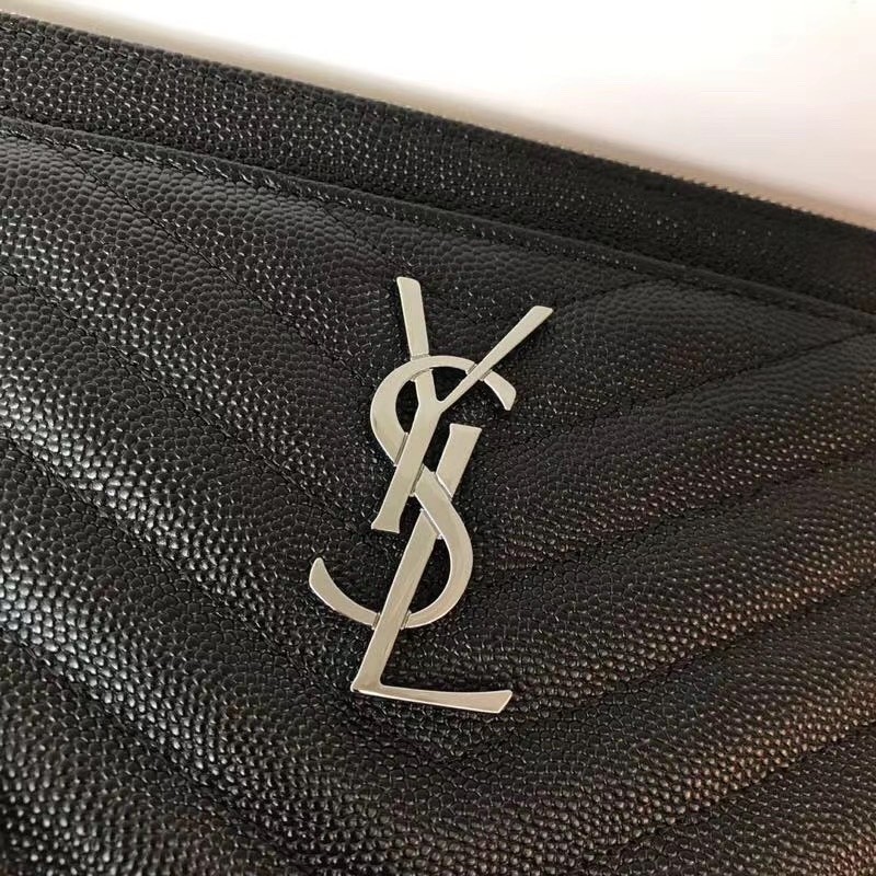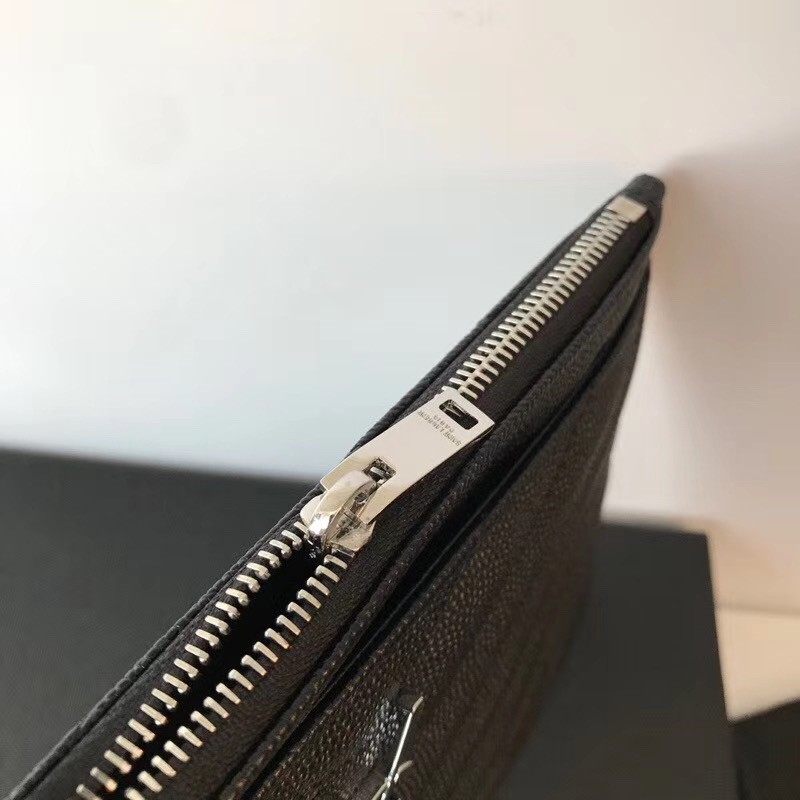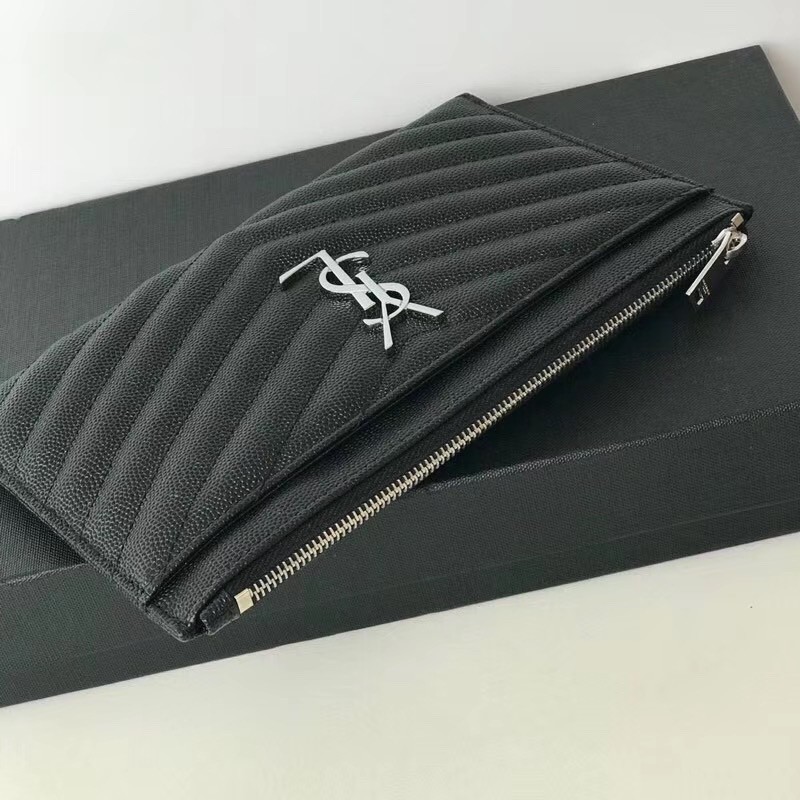 【Saint Laurent 聖羅蘭】V紋荔枝皮手拿包(黑銀款)|立體銀色Logo、全拉鍊大容量、極簡時尚風