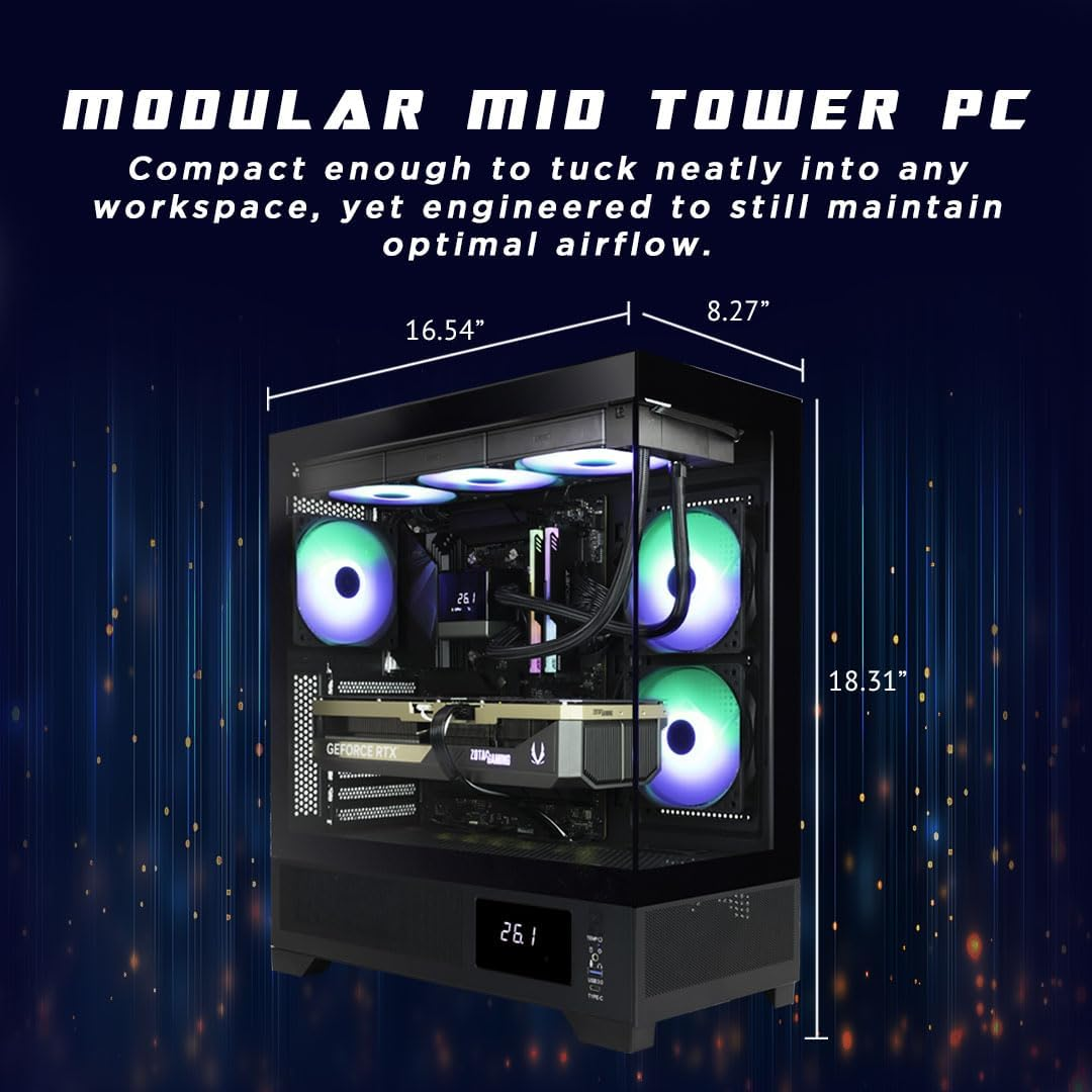 Don't just play games—immerse yourself in them with the MEK Gaming PC, boasting NVIDIA AI-enhanced capabilities. Crafted by ZOTAC, renowned for their award-winning NVIDIA GeForce Graphics Cards and ZBOX Mini PCs, the MEK is meticulously designed and rigorously tested in the USA to ensure seamless gameplay. Say goodbye to bloatware with a clean installation of the Windows 11 PRO OS and dive straight into gaming and content creation with optimized hardware. Experience intelligent gameplay and stunning visuals with the ZOTAC GAMING GeForce RTX 5080 16GB GDDR7 graphics card, equipped with AI-driven DLSS and real-time ray tracing technologies. Whether you're battling foes or creating content, the MEK empowers you with exceptional multitasking capabilities, courtesy of the capable AMD Ryzen 7 9700X AM5 Desktop Processor. Enjoy faster loading times with 32GBs DDR5 6000MHz RAM and a lightning-quick 2TB NVMe M.2 SSD, while the 1000-watt 80+ Gold Rated Power Supply ensures consistent power and reliability. Stay connected with various display ports, immersive 7.1 HD Audio, multiple USB ports, high-speed Ethernet, WiFi 7, and Bluetooth 5.4 connectivity. Compact and stylish, the MEK features a sleek tempered glass side panel and RGB LED 120mm fans for optimal cooling during intense gaming sessions. Maintenance is a breeze with easy-to-clean screwless filters, while professional cable management keeps the MEK neat, organized, and optimized for airflow. Transform your gaming experience today—upgrade to the MEK Gaming PC now!